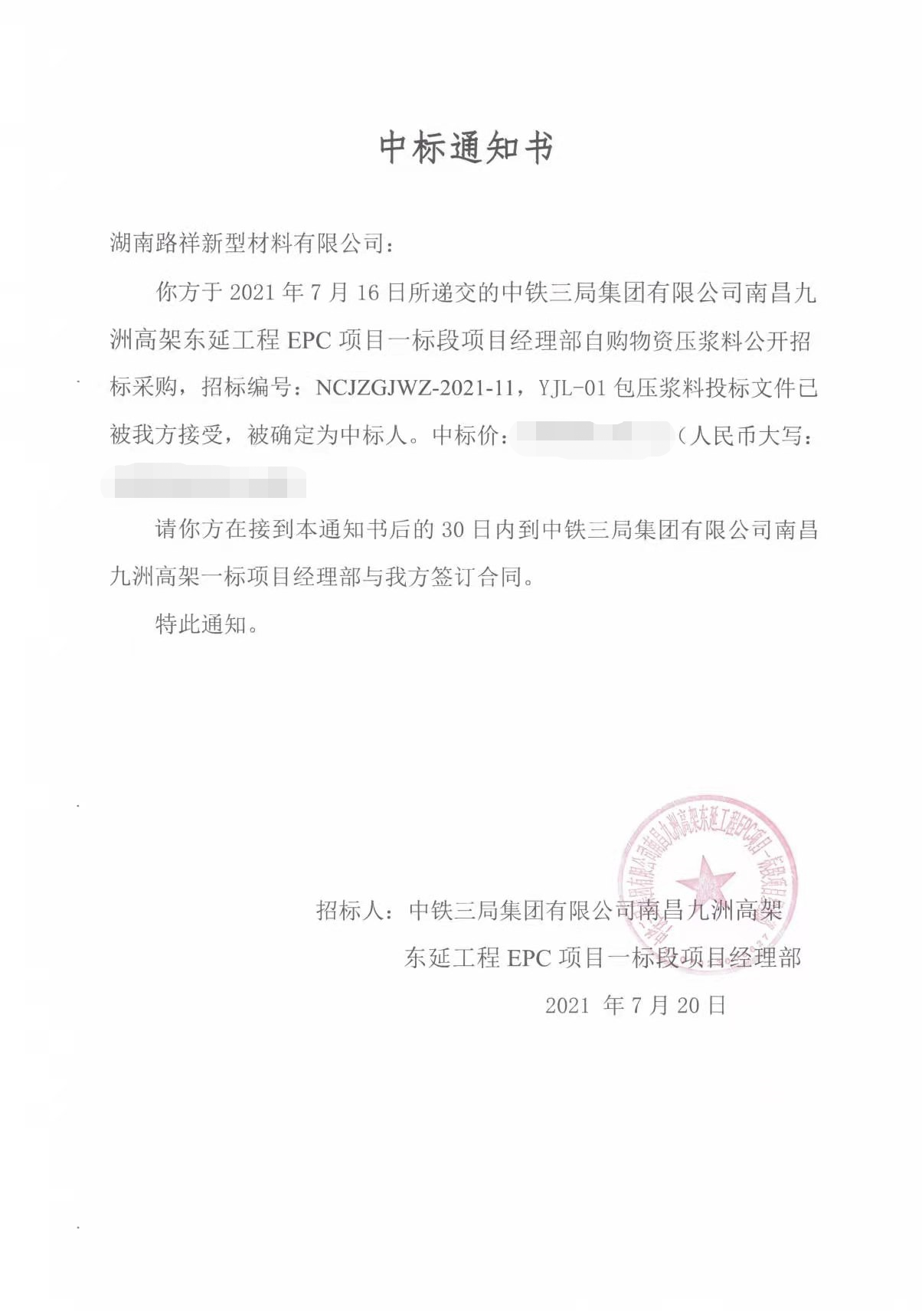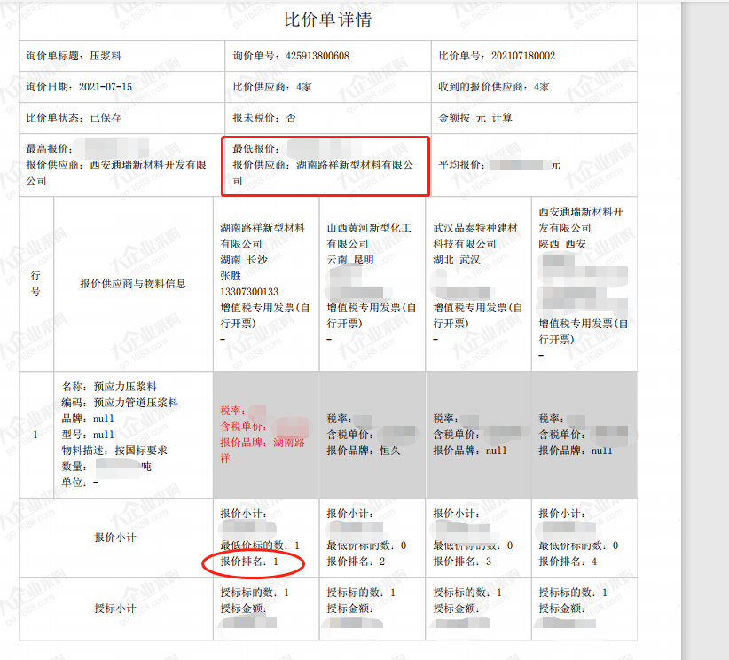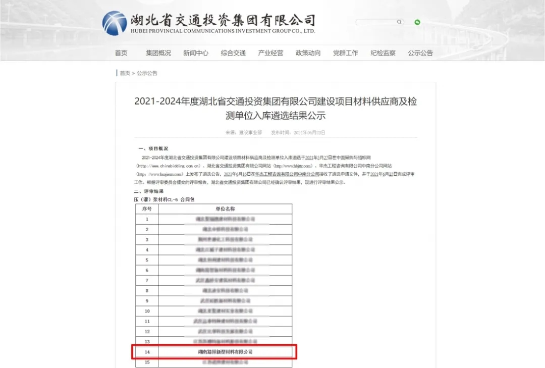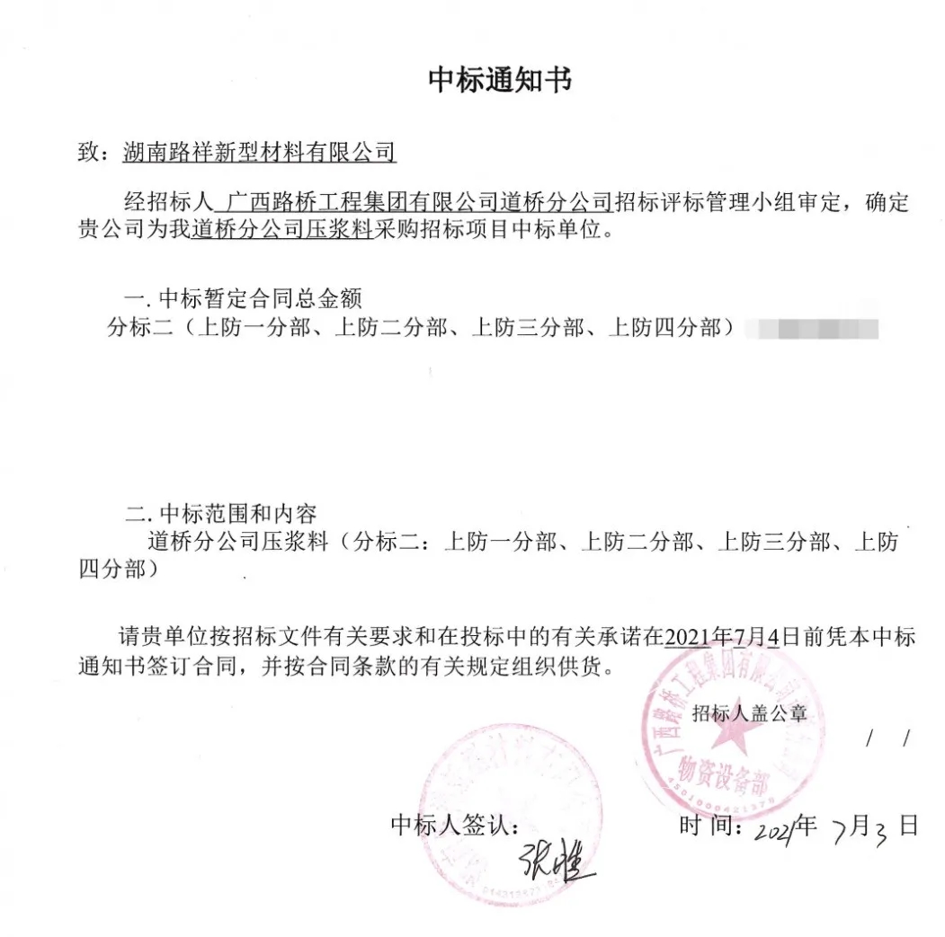 | 湖南路祥最新中標(biāo)通訊: 7月捷報(bào)頻傳,我公司在競(jìng)標(biāo)中,憑借過(guò)硬的產(chǎn)品質(zhì)量,扎實(shí)高效的工作作風(fēng),卓越的運(yùn)作團(tuán)隊(duì)和良好的企業(yè)信譽(yù), 1、公司遞交的廣西路橋工程集團(tuán)有限公司道橋分公司上防一至四分部壓漿料采購(gòu)投標(biāo)文件已被招標(biāo)人接受,被確定為中標(biāo)人。 2、中建交通華南公司2021年華南區(qū)域(佛山、珠海、深圳)壓漿料集中采購(gòu)投標(biāo)文件被確定為中標(biāo)人。 3、中國(guó)電建水電七局貿(mào)易公司廣東省中山市中開高速公路工程壓漿料采購(gòu)項(xiàng)目投標(biāo)文件被確定為中標(biāo)人。 4、中鐵三局集團(tuán)有限公司南昌九州高架一標(biāo)段項(xiàng)目壓漿料采購(gòu)?fù)稑?biāo)文件被確定為中標(biāo)人。 5、廣州市公路工程公司壓漿料采購(gòu)投標(biāo)文件被確定為中標(biāo)人。 6、入選2021-2024年度湖北省交通投資集團(tuán)有限公司建設(shè)項(xiàng)目壓漿料材料供應(yīng)商。 6、入選2021-2024年度湖北省交通投資集團(tuán)有限公司建設(shè)項(xiàng)目壓漿料材料供應(yīng)商。 |