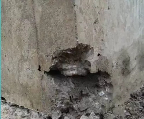 五、爛根 (1)模板根部縫隙堵塞不嚴,漏漿; (2)澆注前未下混凝土配合比和成份相同的無石子砂漿; (3)混凝土和易性差,水灰比過大,石子沉底; (4)澆筑高度過高,混凝土集中一處下料,混凝土離析或石子趕堆; (5)振搗不實; (6)模內清理不凈、濕潤不好。